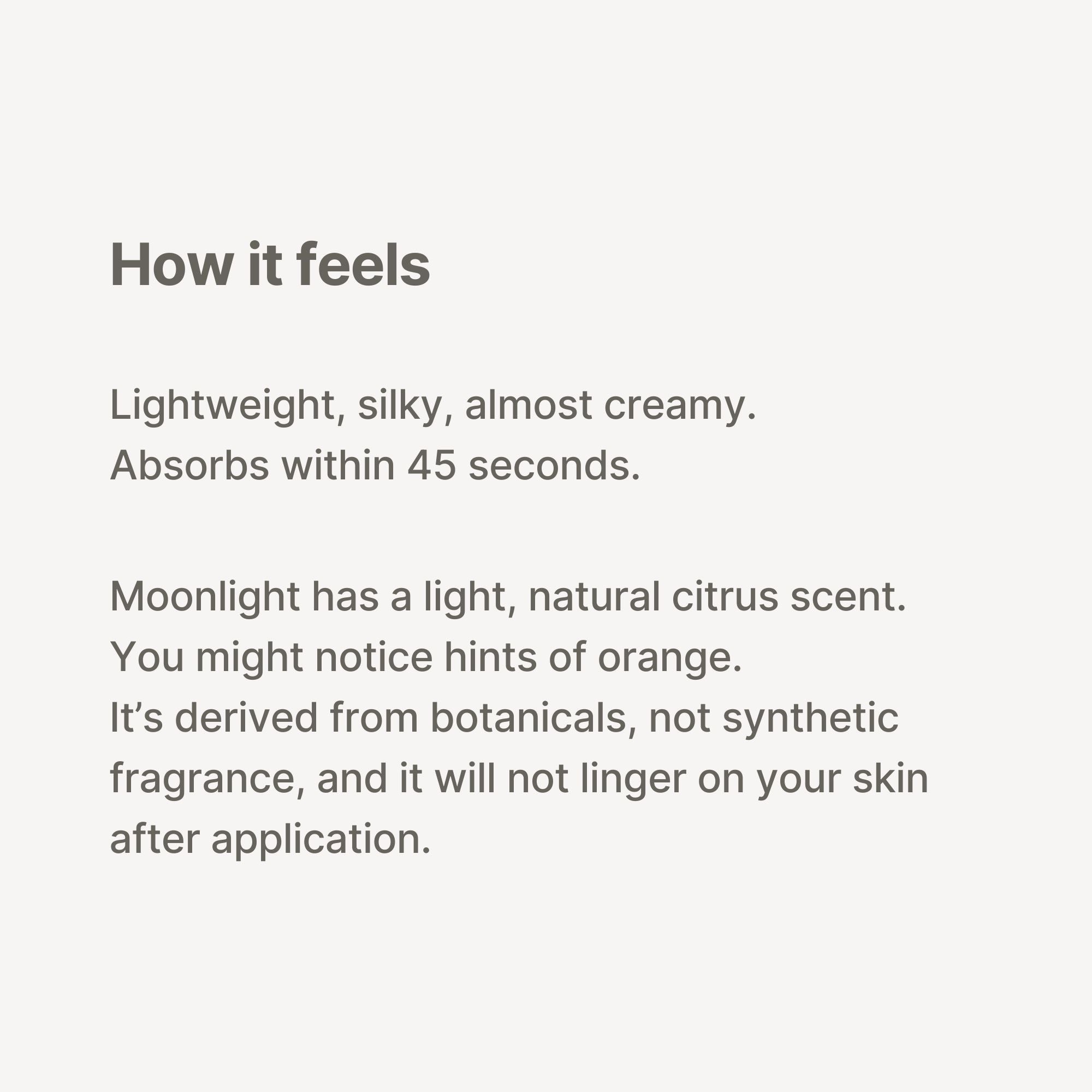 - Apply a thin layer of the Moonlight serum onto your face, neck, and chest.