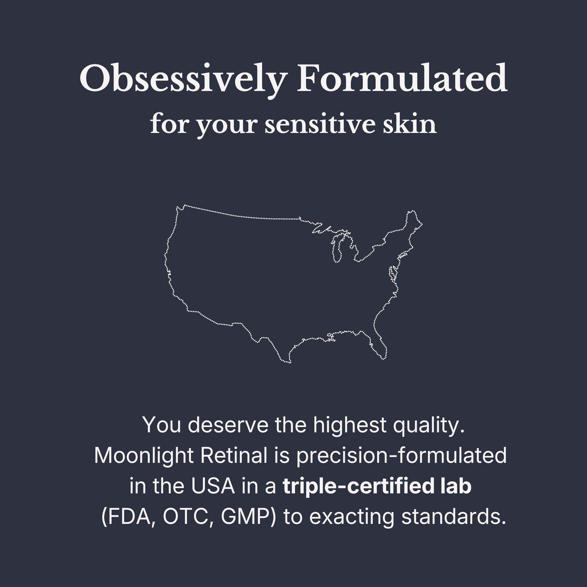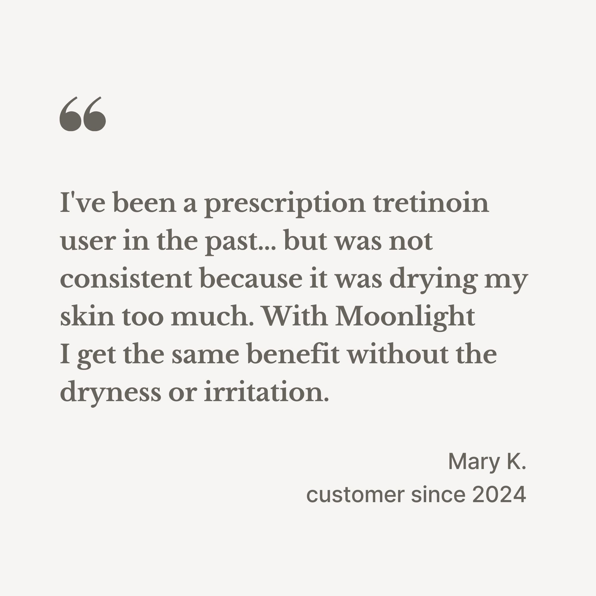 To mitigate the dryness, we include hydrating ingredients (hyaluronic acid, ceramides, squalane) that can compensate for/ repair some of the broken skin barrier. Niacinamide is also included as a skin barrier supporting ingredient that is also a powerful anti-inflammatory and redness fighting agent. Niacinamide is also anti-aging in its own right. Other anti-inflammatory ingredients include bisabolol, aloe, and other botanicals (Magnolia, Green tea, Cloud berry, Cranberry, Polygonum Cuspidatum, Lonicera Japonica, Lonicera Caprifolium). These coformulated ingredients make Moonlight even easier to tolerate for those with sensitive skin.