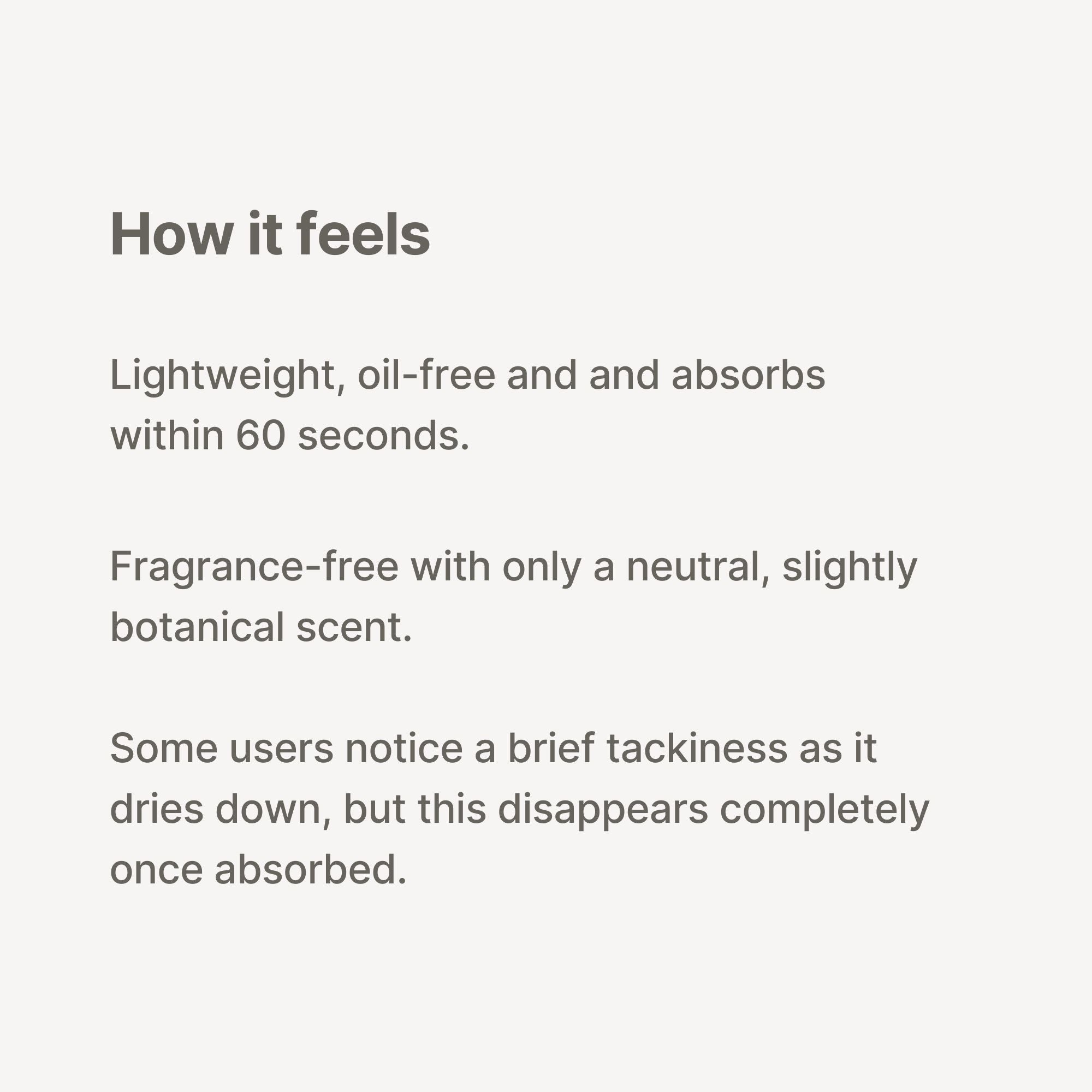 Weeks 1-2: Your skin starts to feel calmer and less reactive. You’ll notice the serum absorbs in about a minute without pilling.