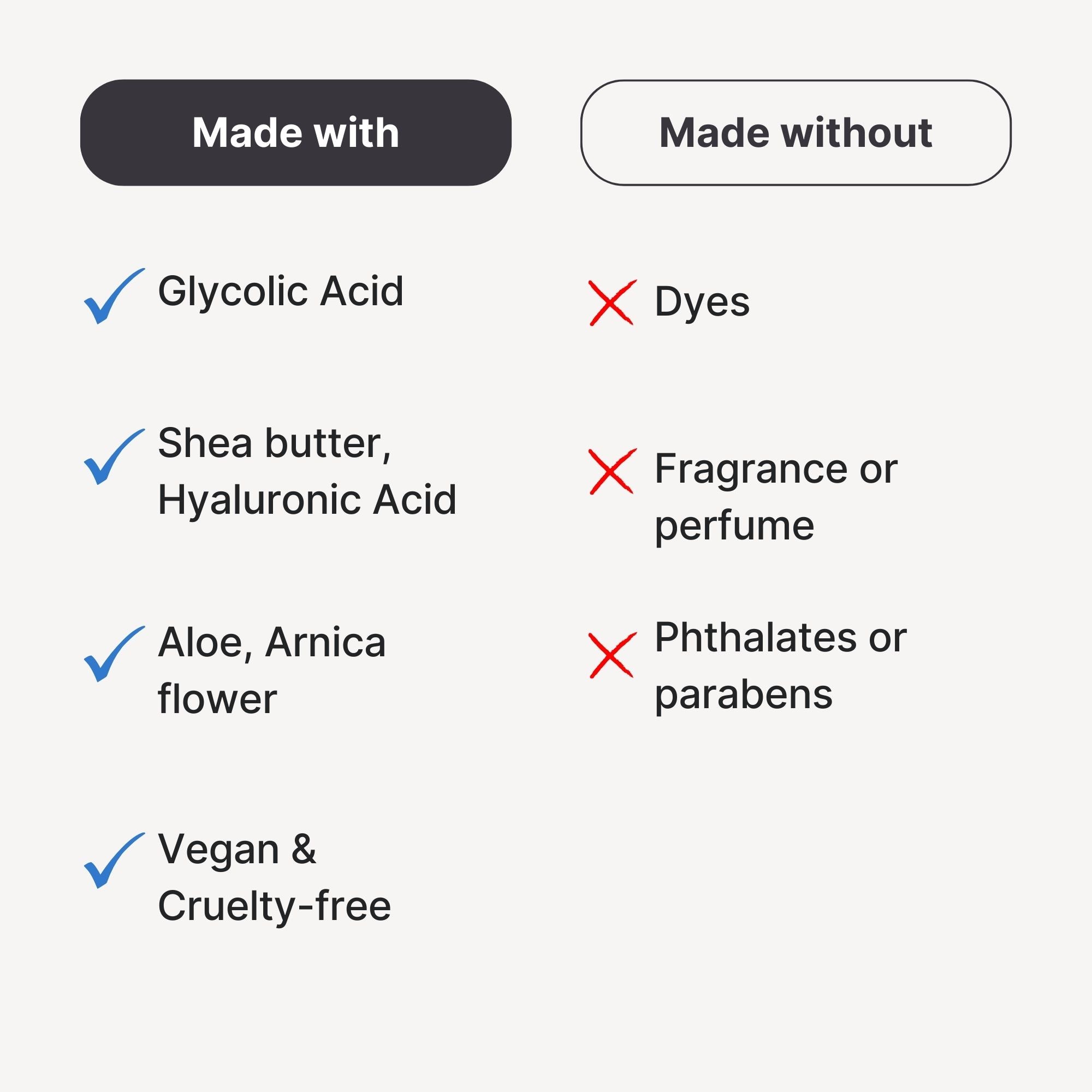 Water (Aqua), Glycolic Acid, Cyclopentasiloxane, C12-15 Alkyl Benzoate, Cetearyl Alcohol, Glyceryl Stearate, PEG-100 Stearate, Glycerin, Squalane, Butyrospermum Parkii (Shea) Butter, Cetearyl Glucoside, Dimethicone, Polyacrylamide, Aloe Barbadensis Leaf Juice, Dimethylmethoxy Chromanyl Palmitate, Arnica Montana Flower Extract, C13-14 Isoparaffin, Sodium Hyaluronate, Phenoxyethanol, Caprylyl Glycol, Ethylhexylglycerin, Hexylene Glycol, Laureth-7, Ammonium Hydroxide, Xanthan Gum, Disodium EDTA, Tocopheryl Acetate, Tocopherol