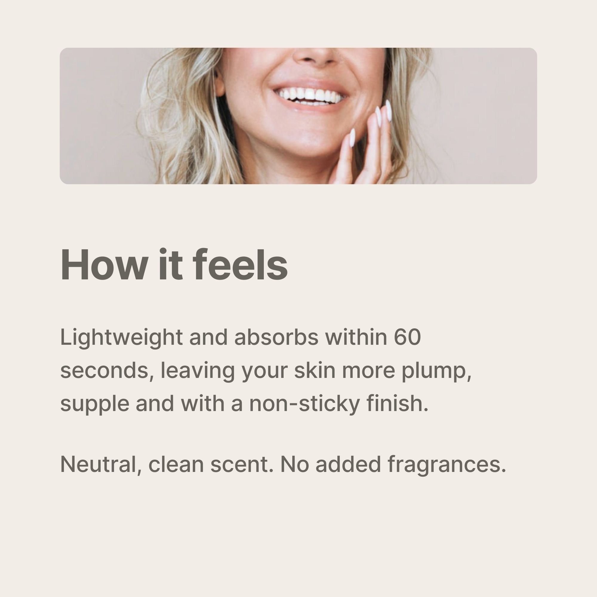 - Draws moisture into the skin for a smooth, plump appearance. This lightweight base is what ensures the serum absorbs instantly without leaving a sticky or tacky residue.