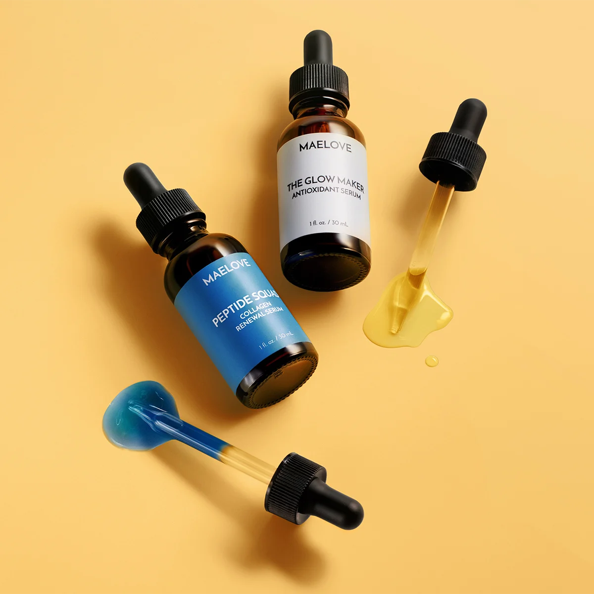 Yes, you can layer Glow Maker followed by Peptide Squad. The concern with using peptides and vitamin C is due to free copper ions, which can be reactive. The form of copper contained in Peptide Squad is bound to copper tripeptide-1, which is a stable compound that naturally occurs in skin. Additional tests conducted confirm a lack of reactivity between Peptide Squad and Glow Maker vitamin C serum.